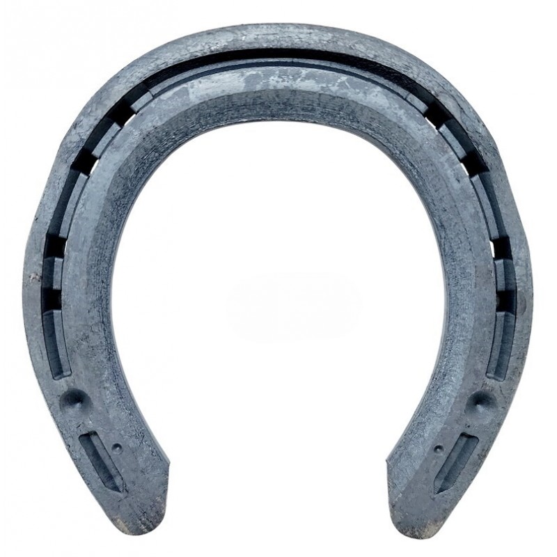 8mm LIBERO CONCAVE is a drop forged horseshoe. These shoes have a stud pilot hole. The hind pattern features 10 nail holes. The Concave feature provides great traction for turf work.